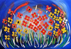In these paintings between the hedges flourish wildflowers free to grow. Metaphorical liberty, dreams, freedom from routines and our daily work. Dreams and desires that exist outside our own 'hedges'.
